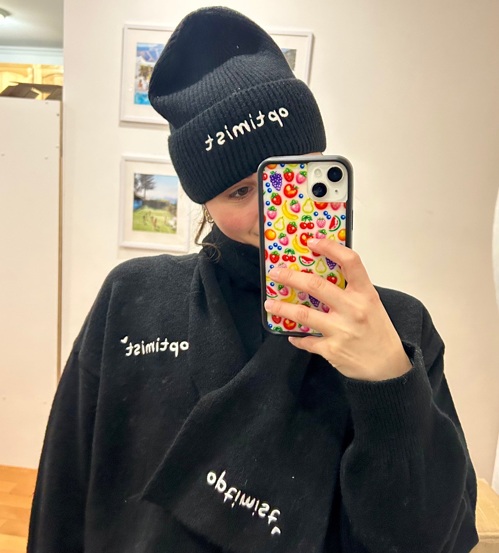 Stay warm and stylish with our cozy beanie, featuring white "Optimist" embroidery. The perfect accessory for looking cute and staying cozy all winter long! **beanie matches black embroidery set!