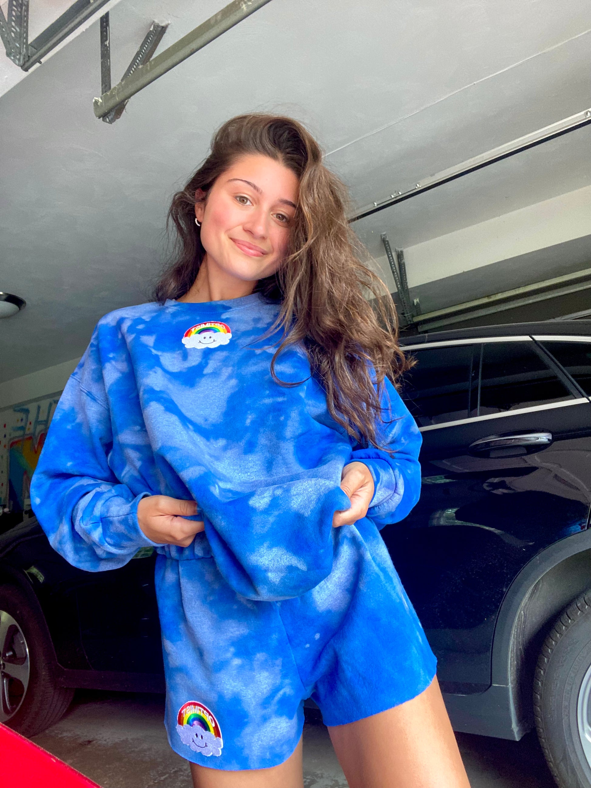 Blue Bleach Dye Crewneck & Sweatshorts Set + Cloud Rainbow Patch
