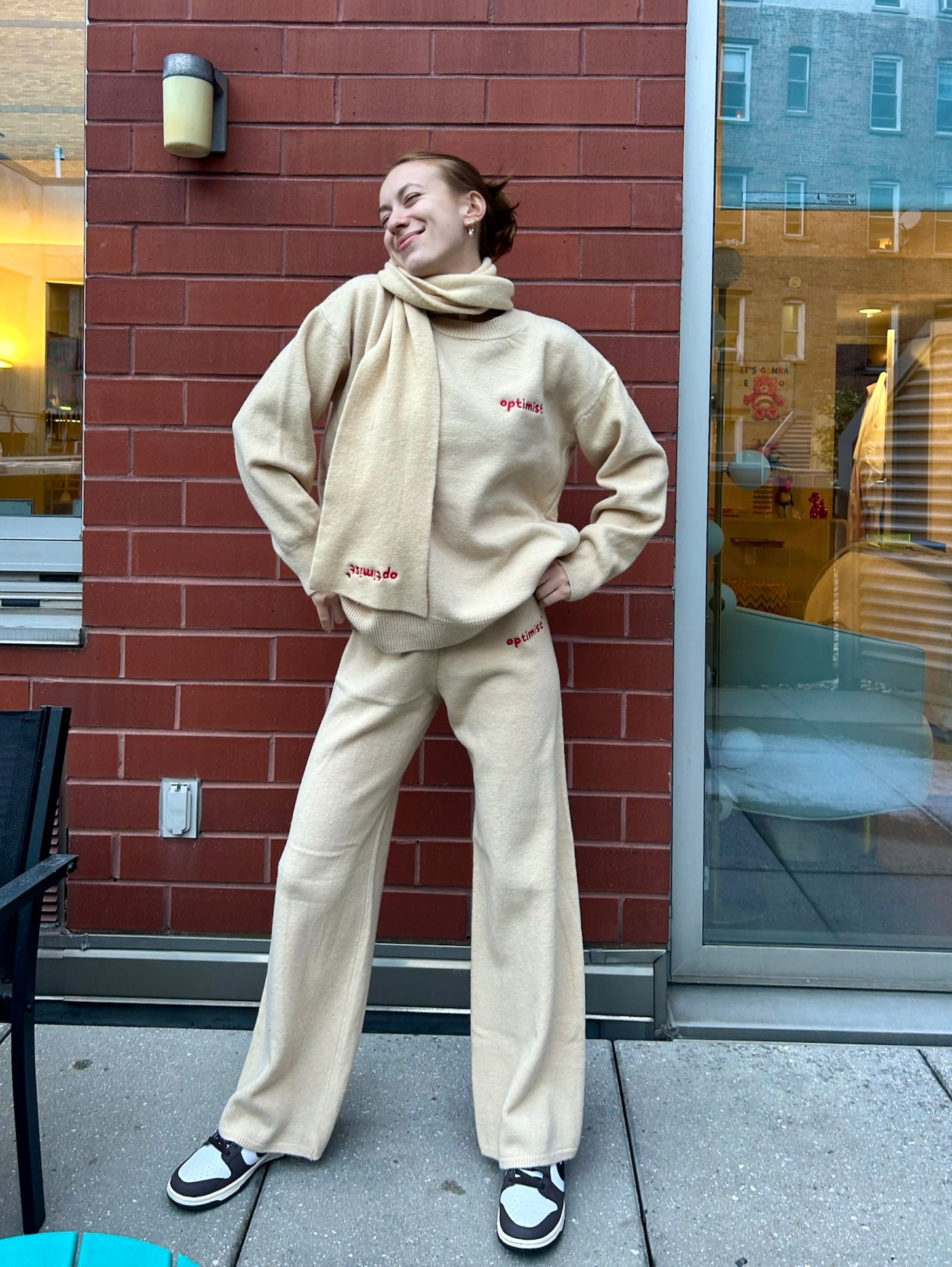 Cream Optimist Knit Crewneck, Sweatpants & Scarf Embroidered Set