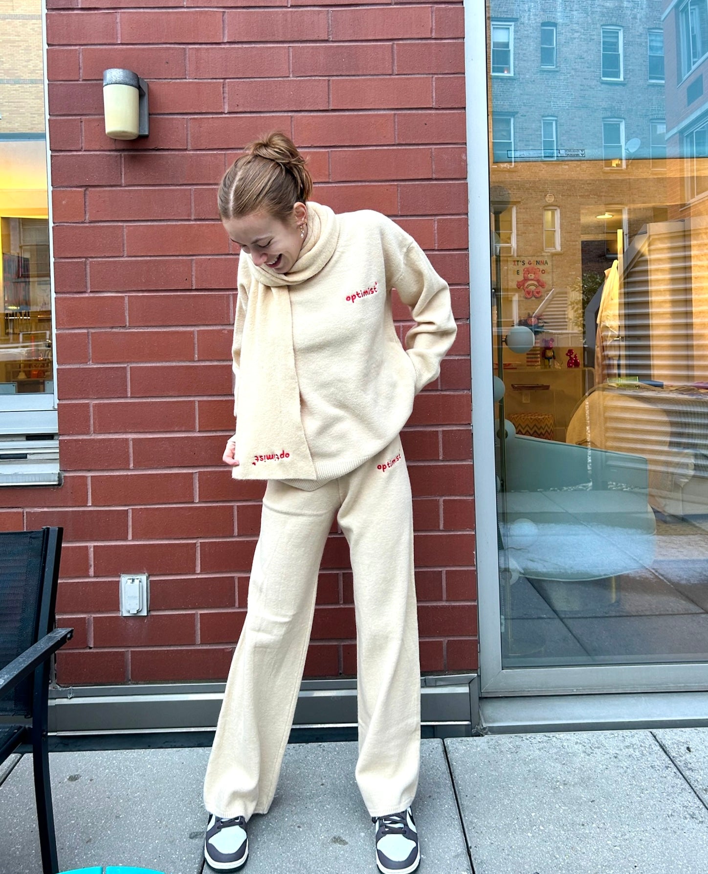 - Slightly oversized fit sweater + open bottom pants = max comfort, minimal effort